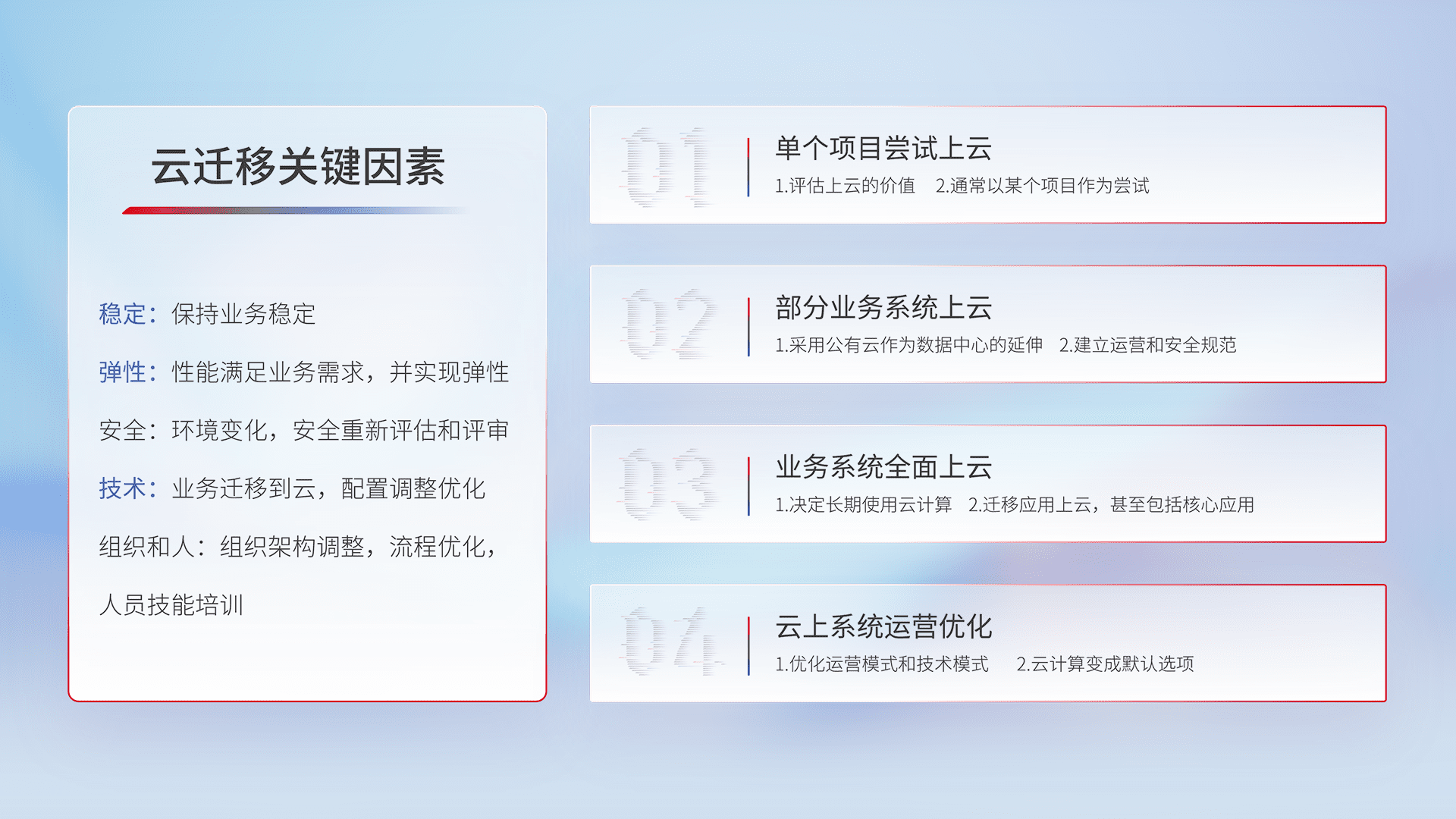 结合实际业务,,,,从规划设计、、、、云平台选型、、云原生改造、、、数据迁移、、、、集成交付,,,,迁移全过程为客户识别最佳上云路径,,做好风险识别管理,,设计网络架构、、、、身份权限、、、安全审计合规、、、操作审计、、日志审计、、、监控告警策略、、、、多站点容灾设计等,,,对云上基础设施进行整体规划,,,提升IT治理水平,,以满足弹性、、、高可用、、、高性能的需求。。