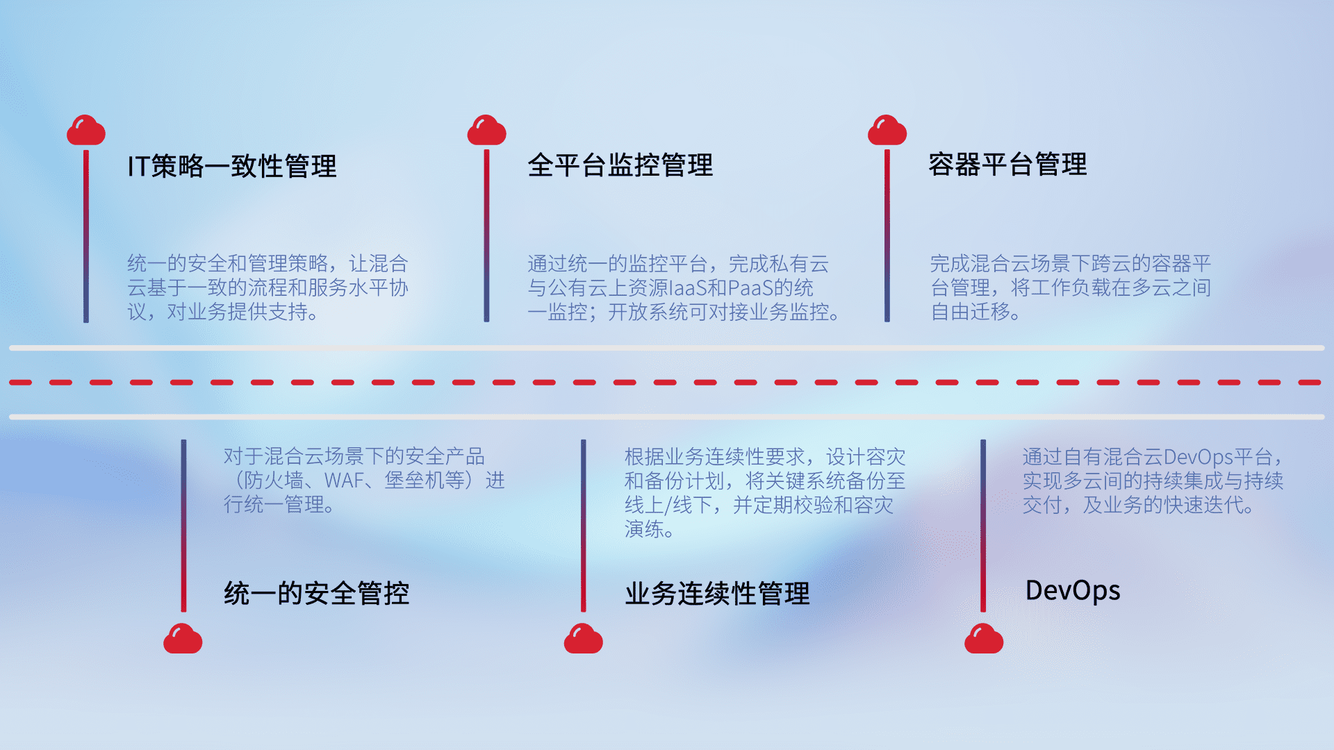 通过多云纳管,,,以统一的资源数据模型把客户的云资源进行抽象和封装,,进而实现对多云资源的统一操作,,,,保障云资源管理的可靠性、、稳定性与可用性。。。。量身定制化运维内容,,,配置、、开发运维、、、、补丁管理、、、备份、、、监控、、、、认证和访问管理、、审计和日常巡检等,,,保障在用云过程中的可靠度,,稳定度以及高可用率。。。。